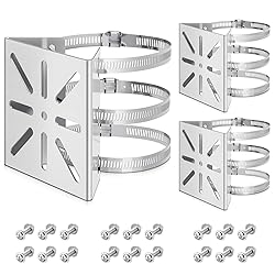 - Features: With our security camera mount, you can easily adjust the camera's angle and orientation. Whether you need a bird's eye view or a ground level perspective, our product ensures you get the perfect angle every time. Our pole mounting brackets are suitable for both smooth round and hexagonal posts, and they can be firmly fixed thanks to the screw lock design. If you need to remove the camera for repairs or adjustments, simply loosen the screws with no additional hassle. Specifications: Material: steel Color: gray Size: Brackets: about 4.64 x 4.37 x 2.12 inches/ 118 x 111 x 54 mm Loop: 0-3.9 inch/ 0-100 mm Package includes: 3 x Pole mounting brackets 6 x Loops Notes: Manual measurement, please allow slight errors on size. The color may exist a slight difference due to different screen displays.