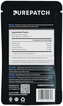 Pure Patch Focus Patch – Plant-Based Vegan Topical Patch – Alpha GPC – Lion’s Mane – L-Tyrosine – Non-Ingestible – Water-Resistant – Gentle on Skin – Gluten Free – Made in USA – 30 Patches