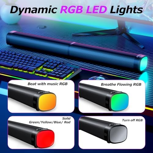 - 【3 Dynamic RGB Light Modes】 Enhance your viewing and gaming experience with vibrant RGB lighting that reacts to your audio. Control the lights by long-pressing the button on the soundbar or remote to turn them on or off; short-press to switch between 3 modes: Music Sync for beat-driven flashes, Breathe Flow with smooth gradient transitions, and Solid Hue for a single-color atmosphere. Paired with powerful bass audio, the lighting adds atmosphere and immersive energy to any setup