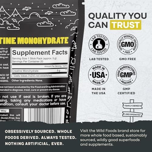 - The Wild Foods Promise: Made in the USA in a GMP-compliant facility, Wild Foods Creatine is rigorously tested for quality and purity. We are committed to providing a clean, effective product to help you achieve your fitness and performance goals.