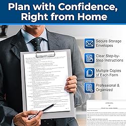 - - All-in-One Will Kit with Forms: This estate planning kit includes a Last Will and Testament, Living Will, and Durable Power of Attorney—plus detailed instructions for each document, ensuring easy and accurate completion at home with no legal confusion. - Last Will and Testament Kit for Families: Our last will testament kit features thick, high-quality printed forms that are customizable and reliable. Use it to clearly define your wishes, name beneficiaries, and outline how your estate will be managed and distributed. - Living Will Kit & Health Care Directive: This living will and last will kit includes a clear, fill-in-the-blank health care directive to record your medical care choices in advance—giving you peace of mind and ensuring your values are honored by family and doctors. - Durable Power of Attorney Included: The will kit includes a durable power of attorney form to assign a trusted person to manage your finances or legal affairs. It’s an essential part of any will planner and ensures your matters are handled if you’re incapacitated. - Will Document Kit with Extra Copies: This make your own will kit provides multiple copies of each legal form—so you can make corrections or restart without hassle. It's one of the most convenient will kits to write at home with forms, ready for real-world use. - Secure and Organized Will Planner: Safely store your completed documents in the included secure envelopes. This printed will and testament kit helps keep your forms protected, organized, and easy to locate when your family needs them most.