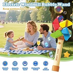 [Colorful Windmill Bubble Wand] Our electric bubble wand with “bubble blowing and windmill spinning” design, press the button, the bubbles spay out in the air as long with the windmill blades spin, the creative concept of bubble shower and rainbow windmill simultaneously offer the double fun for kids, no monotony. [Automatic Bubble Wand] By One button design, the windmill bubble machine will produce 5000+ small bubbles per minute automatically from 5 bubble holes. Thousand of bubbles give kids hours of entertainment of bubble chasing in the bubble world. Built-in shiny lights, when your little children wave the light up bubble wands and colorful bubbles float in the air, always enjoy a fantastic bubble show day and night. [New 360 Leak-proof, Friendly Material] The bubble wand machine for kids upgraded the leak-proof design of sealed and concealed independent bubble bottle ensure the fun playing with no-spill experience, also stays in exquisite look. Made of quality material, the smooth and burr free surface makes it friendly for children to play at ease, portable stick for kids' small hand to hold comfortably, handheld or place on the flat surface with the base. [Easy to Use] The bubble blower adopt with rechargeable battery, no need to replace the traditional batteries frequently, simply charged the battery by the included charging cable when the bubble wand is not use, it is more affordable and environmentally friendly. Supplied with 20 packs concentrated bubble solution, easy to create a beautiful bubble world anytime anytime, bring infinite joy for kids everyday. [Great for] The bubble machine is a kind of toys offer happy fun for kids adults pets, also a delightful atmosphere decoration for birthday party wedding patio beach pool games camping and other outdoor activities. An ideal gift for ages 3 4 5 6 7+ toddlers kids boys and girls. and festival holiday summer outdoor activities.