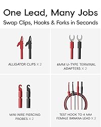 All-Weather Silicone Flexibility: 40 in modular multimeter test leads / volt meter leads stay supple from deep cold to engine heat Modular Push-Fit & Screw-On Design: Pull-out 4 mm banana accessories—hooks, alligator clips, back probe wire piercing probe—swap in seconds; gold tips screw on tight with the mini wrench for rock-steady readings Precision Gold Tips: Ultra-low resistance keeps readings steady on voltmeter multimeter, ohm meter multimeter and power probe multimeter; high-strand 16 AWG lead wire maintains true signals on every test Built for Shop & Field: Tackles automotive multimeter tasks, automotive electrical tools repairs and home electrical test kit projects; perfect for multi testers, power probe accessories and banana plug test leads users Trusted Safety Ratings: Double-insulated silicone electrical test leads and shrouded banana plugs meet CAT III 1000V / CAT IV 600V standards for confident testing in automotive or household systems 25-Piece Complete Kit: Full multimeter leads kit / backprobe test lead kit with 2 x 40 In test leads, 2 x modular test probes, 2 x protective covers, 2 x 2MM tips, 4 x 1MM tips, 2 x 4MM tips, 1 x mini wrench, 2 x alligator clips, 2 x U-type terminal adapters, 2 x wire piercing probes, 1 x storage case, 1 x user manual