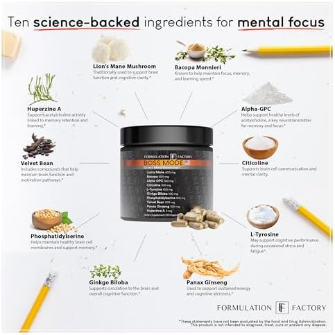 Formulation Factory Boss Mode 10-in-1 Nootropic Cognitive Enhancement Supplement, Focus & Memory Booster, Featuring Lion’s Mane, Bacopa Monnieri, Alpha-GPC, Ginseng & More 120 Capsules (1 Pack)