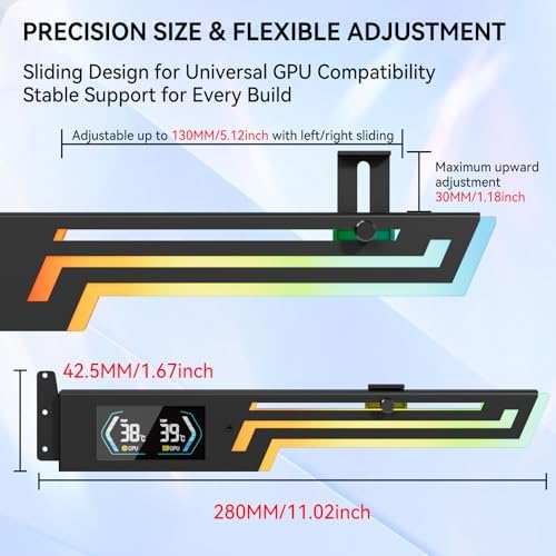 - 【16.8M ARGB Sync & Custom Aesthetics】Unleash 16.8 million RGB colors with 8+ modes (Breathe, Music Sync). Sync via 5V 3 - pin/9 - pin USB, compatible with AURA/RGB Fusion/Polychrome. This graphics card bracket blends style & function, letting your gpu vertical mount setup shine while monitoring temps—ideal for RGB - obsessed builders.