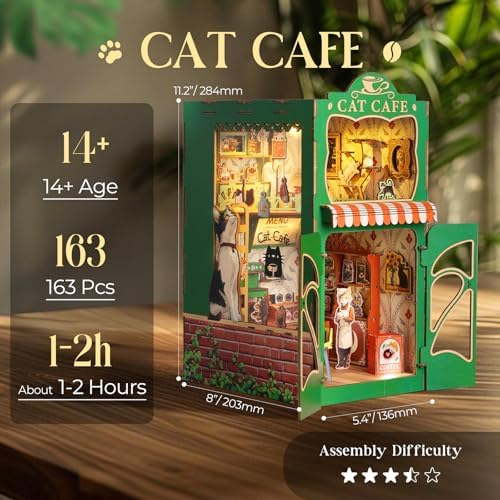 Book Nook Kit,DIY Miniature House Kit for Adults, Teens and Beginners, Dollhouse Booknook Cat Cafe Tiny House Bookshelf Decor 3D Wooden Puzzle, Gifts for Family, Friends