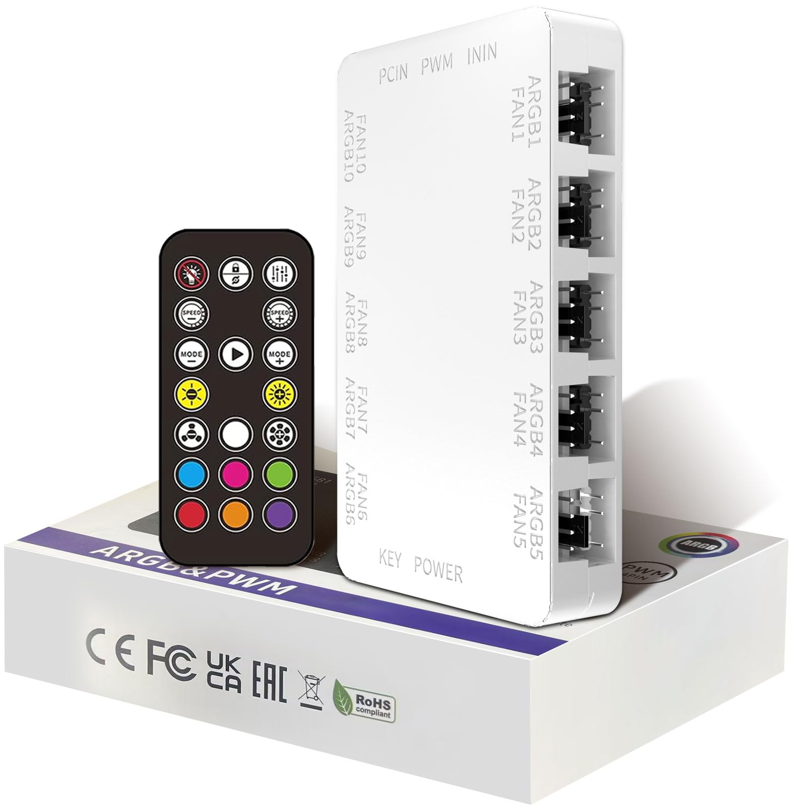 - 【10-Port ARGB & PWM Dual Control】Features 10 PWM (4-pin) and 10 ARGB (5V 3-pin) ports as a fan splitter, syncing fan speed and RGB lighting for case fans, CPU coolers, etc. Ideal as a PWM fan hub or ARGB controller to expand PC cooling and lighting setups.