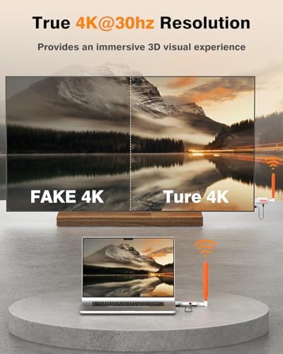 - 【450FT/150M Low-lag highly Performance】 This wireless display adapter stream in stunning ultra HD up to 450FT outdoors (150M), almost no latency, perfect for business meeting, wedding DJs, or outdoor movies. (Note: Transmission distance and speed may be affected when the product passes through walls or encounters obstacles)