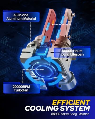 - Over 60,000 Hours Lifespan: Constructed from premium materials like aviation-grade aluminum and a substantial copper baseboard, undergoing extensive testing, these 9005 bulbs provide over 60,000 hours of consistent, stable illumination. A high-speed cooling fan effectively dissipates heat, reducing the need for frequent replacements.