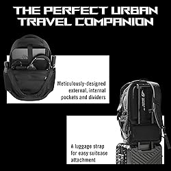 Compatibility: Laptop up to 18 inches. Comfort: 3 breathable mesh pads on the back. Protection: Made of high strength 1260D polyester, water and scratch resistant. Design: ROG iconic reflective cybertext lettering. Security: Hidden pockets on the back for personal items. Practicality: Adjustable chest strap and luggage attachment strap. External dimensions: 52 x 33 x 20 cm. PC compartment dimensions: 40 x 29.5 x 3 cm. Weight: 1.05 kg. Material: Polyester, PU leather, water-repellent closures. Accessories included: bag + warranty booklet.