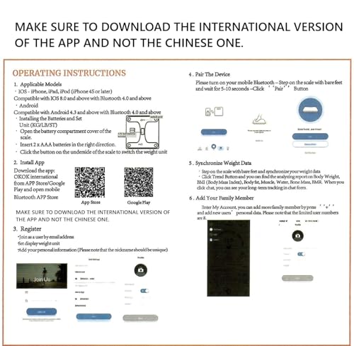 - Easily syncs with popular fitness apps! Our smart body fat scale supports wireless 4.0 and is compatible with Android 4.3 and iOS 8.0 or higher, allowing you to seamlessly connect with apps like Apple Health, Google Fit, and Fitbit. Keep all your health data in one convenient location!