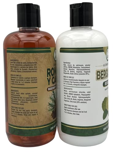 - 🌿 Botanical Power Duo – Shampoo + Conditioner Set Canela, Romero & Sabila + Bergamota Acondicionador. Combines the herbal strength of rosemary, aloe, and cinnamon with the softening boost of bergamot oil. Combinación herbal con romero, sábila y canela, más la suavidad natural del aceite de bergamota.