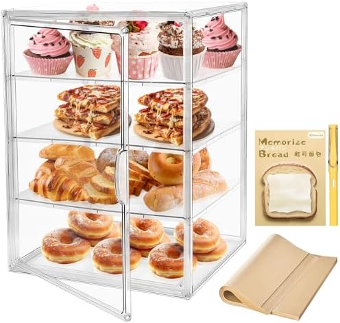 - 【Good Storage Method】4-tier adjustable/removable pastry display case (with 4 height slots and 50x baking papers bread sticky note and chalkboard pen) .Equipped with three adjustable shelves, this space-saving design allows for customizable compartment sizes, keeping your kitchen organized and your items protected