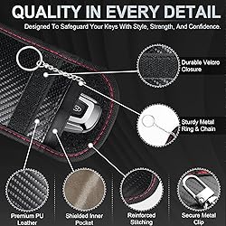 Anti-Theft Security: Our Faraday key fob protector blocks EMF, RFID, and other hacking signals, preventing unauthorized remote access. This powerful Faraday car key bag eliminates the risk of keyless car theft, ensuring thieves are kept at bay. Perfect Size: Designed with a compact 3.15'' × 5.12'' size, this Faraday bag fits all major brand key fobs, car remotes, and smart keys. Easy to carry in your bag, pocket, or glove box for maximum convenience. Each package includes 2 Faraday key fob protectors, perfect for protecting spare keys or multiple vehicles at home. Note: Please check your key size before purchasing. High Quality: Crafted from carbon fiber and dual-layer military-grade shielding fabric, this waterproof Faraday bag blocks WiFi, Bluetooth, GPS, RFID, and key fob signals in just 2 seconds. Protect your vehicle from keyless entry theft with instant, reliable signal blocking. Built to Last: Crafted with thicker fabric and expertly handmade, our Faraday key fob protector offers exceptional durability. The sturdy zinc alloy hook and keychain are designed for strength, ensuring long-lasting use without wear and tear. Attention: To ensure a perfect fit for your car keys, please check the dimensions and compare them with the product specifications provided before ordering. We recommend verifying your car key model to guarantee compatibility. If you have any questions about the product, please contact our team, and we will provide the best solution.