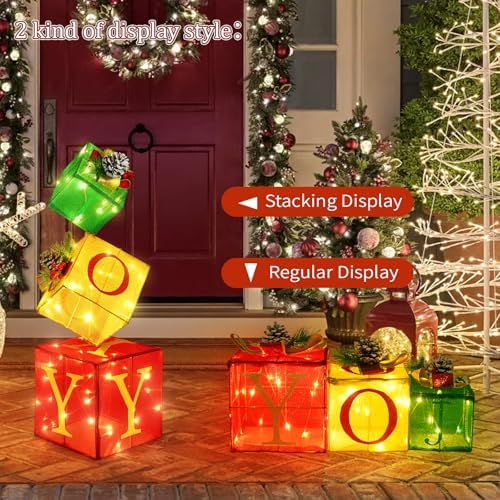 - Versatile Holiday Display: These lighted gift boxes offer 2 arrangement options - display side-by-side or stack up to 2.6ft tall. Perfect for tabletops, mantels & parties, they bring festive cheer with warm glowing lights. Set of 4 beautifully decorated boxes for stunning holiday decor