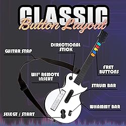 Compatible with all Guitar Hero titles and Rock Band 2 & 3 on Nintendo Wii and Wii U. Note: Not compatible with Rock Band 1. Features a dedicated slot to securely house your Wii Remote, ensuring easy synchronization and stable gameplay. Lightweight construction with an adjustable strap for comfortable play sessions and easy transport. Equipped with high-sensitivity fret buttons and a tactile strum bar for accurate note tracking and immersive play. Powered directly through the Wii Remote—no extra batteries or charging required. Important Usage Notes – Ensure the Wii Remote is firmly inserted and fully charged. If gameplay disconnects, check the Wii console remote or game disc, as interruptions may come from the system rather than the guitar controller.