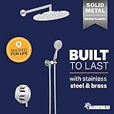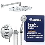 COMPLETE SHOWER SYSTEM SET — Walk in bathroom shower faucet set includes shower valve kit with trim, rainfall shower head, handheld shower, overhead arm, wall mount, and 72" metal hose. SOLID METAL, BUILT TO LAST — From the shower heads to the mixing valve and trim, HammerHead uses the highest quality stainless steel and brass, corrosion-resistant finishes and is cUPC certified. 2 HANDLE SHOWER CONTROL WITH INTEGRATED DIVERTER — One handle adjusts the water volume and temperature and the other handle easily switches between the rain shower head and handheld showerhead. 10" RAIN SHOWER HEAD SYSTEM — Large rainfall shower head with 16" wall mount shower arm delivers wide coverage without needing ceiling plumbing. 3-SPRAY SETTINGS — High pressure handheld shower head features wide, massage, and mist spray patterns. Includes 72" kink-resistant metal hose and adjustable wall mount holder for flexible shower use.