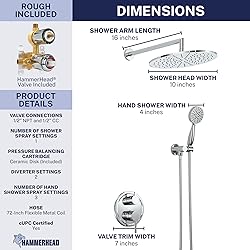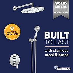 - Transform your bathroom with the HammerHead Rain Shower System Set, a complete shower faucet system designed for durability and professional installation. This shower system with handheld includes everything for a modern bathroom shower upgrade. COMPLETE SHOWER KIT: Our bathroom shower system features a 2-handle shower valve and trim kit with diverter, 10-inch rain shower head, 3-spray handheld shower, 16-inch overhead arm with flange, wall mount, and 72-inch metal hose. This shower set with valve provides a complete solution for new construction or remodels. PREMIUM SHOWER FIXTURES: Built with stainless steel and brass shower fixtures, this shower hardware set delivers long-term reliability. Solid metal construction ensures corrosion resistance, while cUPC certification guarantees plumber-approved quality.