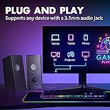 【Full-Range Stereo Sound Quality】Advanced sound drivers and a full-range 2.0 channel(9W plus 2RMS Max), this computer speakers provides the 3D stereo for your entertainment such as watching movies, gaming, and listening to music.This gaming speakers achieves excellent lows-mid-treble for an immersive audio experience. 【Universal Compatibility】Wired Gaming speakers are built-in with 3.5mm audio and match computers, desktops, PCs, laptops tablet MacBook with a USB C to USB adapter. Suitable for Windows (Vista/7/8/ 10/11), Mac OS, Chrome OS, Linux, UNIX, and more all various types. 【Plug and Play Instantly】USB powered 5V- Bingxue speakers for gaming monitor are designed for your portable and hand carrying. Enjoy Plug and Play instantly- just plug in the USB powered cable and the 3.5mm earphone jack for audio cable to start music world. 【One Knob Volume Control】Integrated volume up and volume down buttons (Min to Max) to offer you simple and accurately listening and hearing gaming and movie-watching experience. The cable between the desktop speakers is 47 inches long, and can be placed on either side of the monitor or desktop/laptop/pc/tablet. 【Factory Products Technical Workmanship】Frequency:150Hz-20Khz, S/N:≥88dB, Bass driver unit 2.0 plus 2 transparency speaker net with light bluetooth LED power lighting.Portable and light weight.