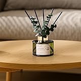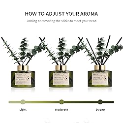 Scent: Lavender Eucalyptus. The fragrance like taking a stroll in a peaceful lavender garden. With each step, the fresh mint flavor greets you, and the soothing earthy scent of vanilla embraces your senses Green Forest Series: Inspired by the forest, the simple rattan incense with the embellishment of plants instantly infuses your home with vibrant greenery, making you feel relaxed and at rest Diffuser Set Contents: 1 bottle of high quality liquid aromatherapy, 5 fiber sticks with high volatility, 3 eucalyptus sticks(enhance and diffuse fragrance) and 1 luxurious and beautiful box High-quality Materials: The authentic and high-quality scent made from natural essential oils. This 6.76-ounce green glass reed diffuser, paired with exquisite packaging, will enhance the beauty of any room Thoughtful Gift: If you are tired of traditional gifts, reed diffusers must be the perfect and creative gift for Christmas, Thanksgiving, Mother's Day, Valentine's Day, Birthdays, Relocation. It is also the perfect shelf decoration gift