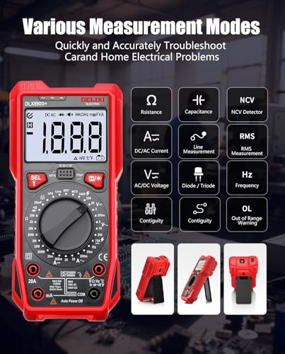 - WIDE APPLICATIONS: superior performance, this powerhouse multimeter measures up to 1000V DC voltage (surpassing standard 600V meters), robust 20A current (exceeding typical 10A limits), as well as resistance, capacitance, NCV, continuity, diodes, transistors, frequency, and features live/neutral wire detection and square wave output. Dominate automotive, industrial, and lab settings with this all-in-one professional instrument.