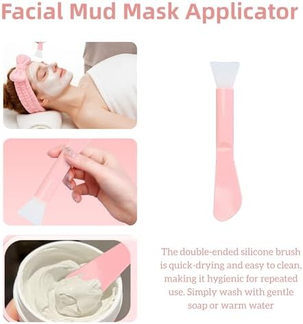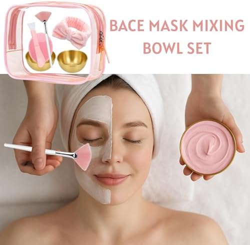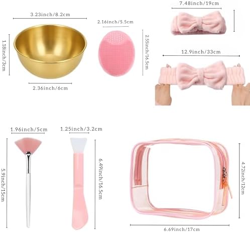 - 【Facial Kits】This Facial Care Set Contains 2 Gold Mask Bowls (3.23x1.18 Inches), 1 Pink Handle Fan Brush (5.9x1.96 Inches), And 1 Flat Mask Brush (6.4 Inches Long). 1 Pink Cleansing Headband (7.48x2.36 Inches), 1 Silicone Cleansing Brush (2.55x2.16 Inches), And A Transparent Makeup Bag (6.69x4.72 Inches). This Is The Perfect Combination Of Facial Makeup And Care