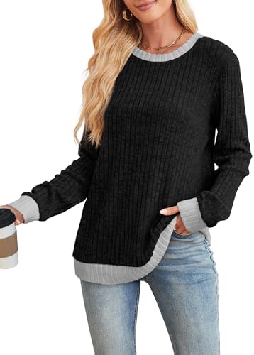 Sampeel Womens Tops Long Sleeve Shirts Lightweight Sweaters Loose Fit Crewneck Color Block Fall Fashion Outfits