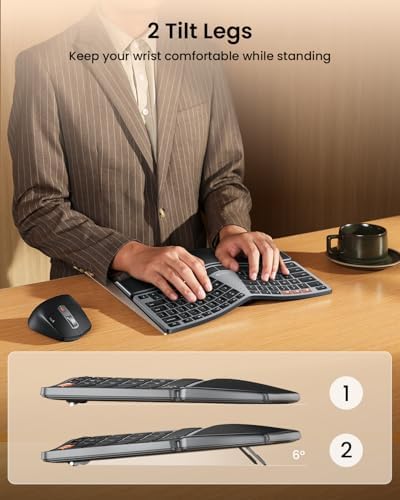 - Two Adjustable Tilt Legs: There are only 2 adjustable tilt legs on the bottom of the ergonomic keyboard, keeps your wrist in a relaxed and comfortable typing posture while standing. The tilting is on the front where the palm rest is, helping lift up the bottom of the keyboard.
