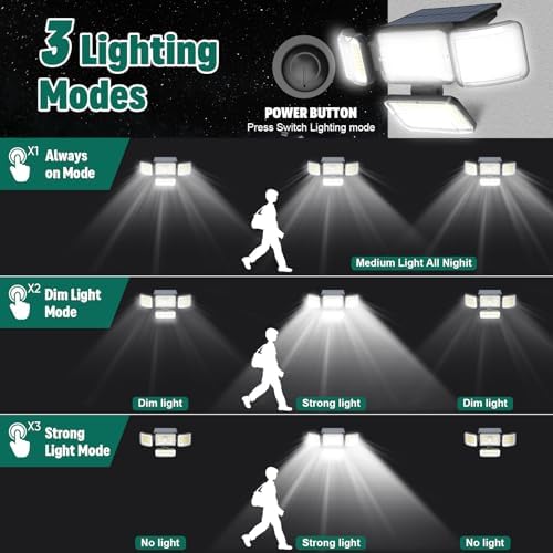 - 【Smart Motion Sensor & 270° wide angle】: Our solar motion sensor lights outdoor are equipped with 4 adjustable light heads and a 270° wide dectection angle which can illuminates a 1600sq ft yard, which provides you with higher brightness and wider coverage.