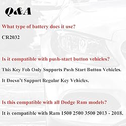 - Note: This is Aftermarket Remote Key Fob/Non-OEM, and it Doesn’t Come with LOGO or Badge. Important Note: It only Support Push Start Button Vehicles, It Doesn’t Supports Regular Key Vehicles. Compatible with Dodge Models: Ram 1500 2500 3500 2013 2014 2015 2016 2017 2018 Specification: FCC ID: GQ4-54T Compatible with Part Numbers: 56046956AC, 68288424AB Type:4 Button Remote Frequency: 433 Mhz Battery Type: Coin / Button Cell Battery Material: Lithium 3v Battery