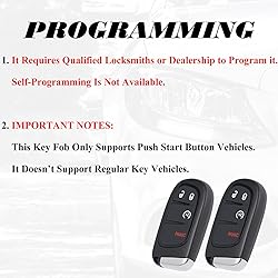HIGH-QUALITY: Every Single Keyless Entry Remote Control Car Key Fob is Fully Pre-tested by Professional Locksmith Tools before Shipping. All Our Key Fobs are Pre-installed with Battery and Electronics. COMPATIBILITY: Compatible with FCC ID GQ4-54T. Please Check Our Product Description and Vehicle Fitment Tool for Full Compatible Vehicles List. This Remote Start Key Fob Replacement Is Compatible with Dodge Ram 1500 2500 3500 2013 2014 2015 2016 2017 2018. REPLACEMENT: This Keyless Entry Remote Start Control Car Key Fob Replacement Is Compatible with Part Numbers: 56046956AC, 56046956AE, 56046956AF; 56046956AD, 68288424AB, 68288424AA; 56046956AE. PROGRAMMING: It Requires Qualified Locksmiths or Dealership to Program it. Self-Programming Is Not Available. PACKING LIST: 2X Keyless Entry Remote Start Control Key Fob with Electronics and Battery Pre-Installed. Ready to Program.