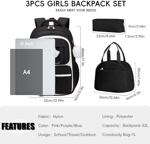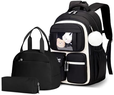 Girls Backpack with Lunch Box 3Pcs, Kawaii School Bag Set for Kid Elementary Middle School, Multi-Pocket Cute Laptop Bookbag Lightweight, Black