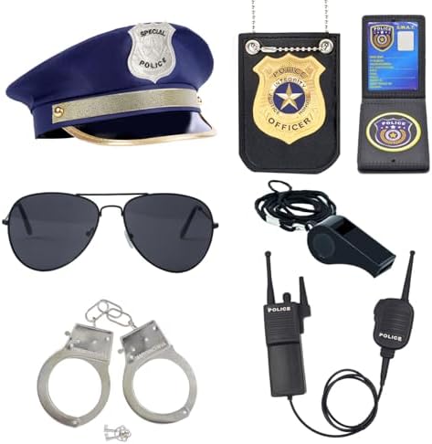 Stop in the name of the law! You have the right to accessorize! Whatever you forget to add to your costume can be held against you in a court of authenticity. No, seriously. This thing looks pretty real and will go along with just about any police uniform. It holds everything you need! Add these police costume accessories to your uniform and complete your look in authentic style! SPECIFICATIONS ★Police Hat - Polyester;head circumference 58cm/22.8 inches ★Police Badge - Alloy metal; with long chain, belt clip ★Handcuff - Stainless steel metal, with 2 keys ★Aviator Glasses - Metal AC lens, Lens width:58mm (2.28") | Lens height:51mm (2") | Bridge width:17mm (0.67") | Frame width:130mm (5.12") |Arm length:131mm (5.16") ★Walkie Talkie: Black, plastic, non-function ★Perfect for police pretend play accessory, school classroom toys, Chicago PD pretend Play, party favor supplies, dress up collection, birthday party, performance and photography... Package Included 1*Police Hat 1* Toy Handcuffs 1*Sunglasses 1*Policeman Badge 1*Toy Walkie Talkie 1 *Whistle