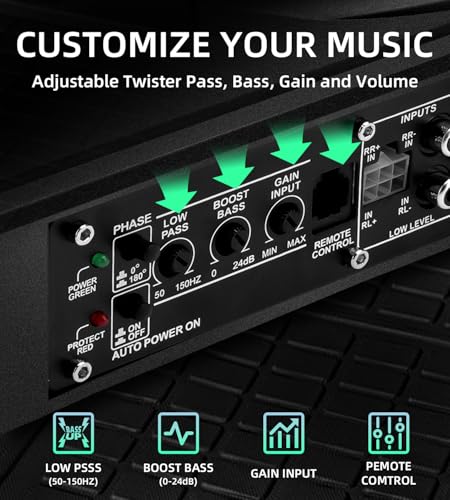 - 【1200W Peak Super Bass】Up to 1200W peak output of under seat subwoofers with amp, Individual Control for Low Pass/Gain/Boost Bass, Adjust the car subwoofer effect to your favorite mode and feel the power of the bass!