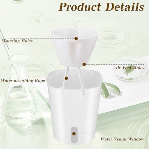 - Each set of our succulent pot include 2 parts (package include 10 sets in total): inner pot and outer pot, excessive water will drain into the outer pot along the rope, prevent overwatering. The outer plant pot has visible window to observe how much the excessive water is, and the rope absorbs the excessive water to supply plants when plants need water, so you never worry about forgetting watering or watering too much with our self-watering and self-aerating flower pots.