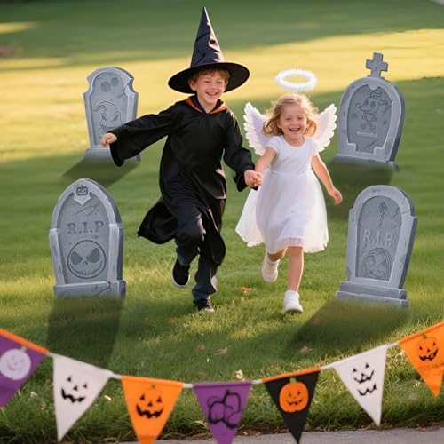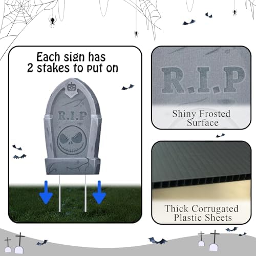 - 【FESTIVE ATMOSPHERE】Nice Halloween decor to decorate on your Halloween yard. Simply insert two stakes into each gravestones sign and plant them in the ground or lawn. These Halloween yard decorations intensify the spooky atmosphere of the season.