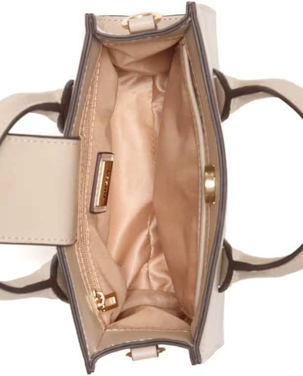 GUESS Factory Women's Irvington Mini Tote Faux-leather mini tote bag Gold-tone hardware and logo emblem Interior lining and pocketing Fold-over strap with magnetic snap-button closure Rolled top handles with 2.75" drop. Adjustable crossbody strap. 7"W x 6.75"H x 2.75"D