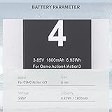 Parameters:Lithium Ion battery; Voltage: 3.85V; Capacity: 1850mAh/7.12Wh; Type: Li-ion, Runtime: ≥600 minutes per charge, Sufficient Battery Capacity Support Best battery Power for the camera Compatible Models: for fully fit with OSMO Action 4 , Action 3 cameras and the dual-channel charger is compatible with OEM and Original OSMO Action 3/Action 4 batteries. Note: replacement action 4 battery used in action 5 will have differenct volts from original action 5 battery 2-Channel LED Charger: 2-channel LED charger for OSMO Action 4 , Action 3 cameras ith no memory effect., which can charge 2 batteries at same time. Each channel has indicator light for charing, The charging indicator show the status of charging that red light means charging and green light means fully charged High Quality Manufacturing: battery has a built in smart chip,which provides Multiple Protection for your camera, The lithium-ion battery comes with built-in over-charge, over-discharge, over-voltage, over-current, and over-heating protection.Built-in circuit protection, enhances safety of usage and extends battery life This battery charger has two charging methods: ① use its built-in USB-A charging cable; ② use its USB-C input interface. It allows being charged via USB adapter, car charger, power bank. You can choose the charging method you want