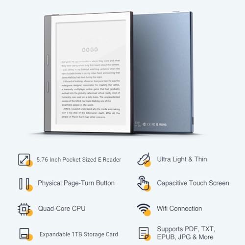 - 5.76 Inch Display: The E reader boasts a 5.76 inch HD display with 920x680 resolution and 198ppi, utilizing e paper technology, offering paper like quick page turns for an authentic reading experience.