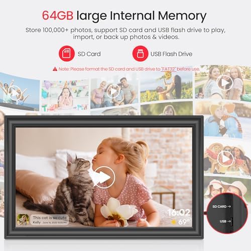 - 【64GB Large Memory & Expandable Storage】This 15.6-inch large digital photo frame has built-in 64GB storage, can store about 100,000 photos to keep your favorite memories always within reach. It also supports easy expansion with SD cards and USB flash drives, making it simple to import, export, and back up photos and videos—even non-WiFi. Note: 1. Please make sure the SD card/USB drive is in "FAT32" format before use. 2. For better compatibility, we recommend using a 32GB SD card/USB drive, as 64GB and 128GB options may not work properly with the frame