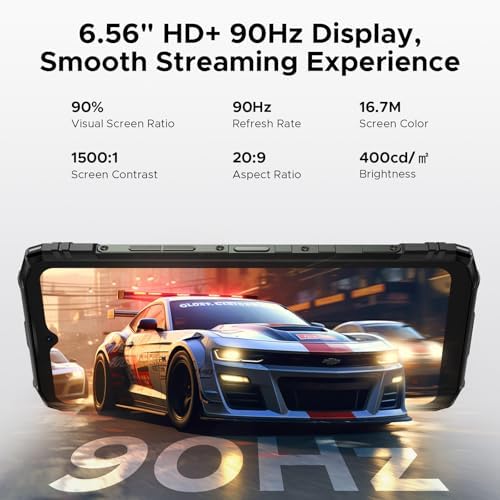 - 𝟔.𝟓𝟔”𝐇𝐃+ 𝟗𝟎𝐇z 𝐈𝐏𝐒 𝐖aterdrop 𝐒creen:The Blade10 Pro rugged phones unlocked features a 6.6-inch HD+ IPS waterdrop screen, providing a wider viewing range when watching videos, playing games, or browsing the web. The IPS screen offers an extremely wide viewing angle, allowing you to view the screen from multiple different angles. The waterdrop screen design maximizes the display area, delivering a more immersive visual experience within the same device dimensions. The 90Hz high refresh rate ensures smooth and fluid scrolling, gaming, and streaming.