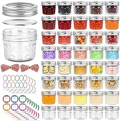 Food Grade Glass: These 4 oz mason jars with lids are made of high-quality food-grade glass, BPA-free and lead-free, with no issue re-using. Their high visibility allows you to see the content inside easily. Note: Dishwasher Safe & Microwave Safe (without the lid), Refrigerator Safe. Sealing & Leak Proof: Each canning jar has a solid screw seal band and a flat metal disc with a leak-proof adhesive layer, preventing air and excessive moisture in. The split-type design can create a good sealing environment to keep fresh for longer. No worry about leakage or spills! Food Storage & DIY: These mini mason jars are perfect for honey, jam, jelly, nuts, candy, spices, caviar, small treats, and more. They can also be great DIY projects with homemade candles, face cream, balm, or scrub as wedding favors, shower favors, or other holiday gifts. Diamond-Cut Small Jar: These small mason jars feature a stunning diamond-patterned glass design, creating a classic and exquisite look. With the compact size, They are perfect for sub-packages and sharing. Package Includes: The set comes with 40pcs 4oz empty glass mason jars with silver split-type lids, 42 circular and 48 oval labels to mark, 1 bundle of string for decor. All of them are packaged carefully in a foam tray to keep them far from damaging and cracking.