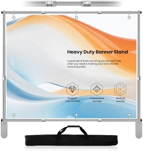 - 【Adjustable Frame】: The telescopic banner stand is suitable for multiple size, They are all telescopic and can be infinitely adjusted to match the size you need, Height adjustable (Min 3.4ft - Max 10ft), width adjustable (Min 6.2ft - Max 10ft).