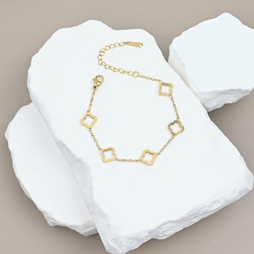 18K Gold Plated Four Leaf Clover Link Bracelet for Women. Trendy Lucky Hollow Clover Women's Gold Jewelry Gift. Best Bracelet for Stack.