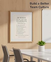 - Talent Wins Games, But Teamwork Wins Championships. Whether running a startup, varsity basketball team, or corporate sales department, friction is the enemy of progress. You can’t be everywhere at once to mediate conflicts or remind people to ‘assume good intent.’ Your environment needs to do the heavy lifting. More Than a Poster—A Team Performance Manifesto This Better Teammate Edition condenses complex interpersonal dynamics into 10 simple, actionable habits. Clean, minimalist typography ensures it feels like a professional standard, not a cheesy motivational poster. Why Our Professional Team-Building Prints Stand Apart: ✓ Premium Luster Photo Paper with weight and feel of professional photographs ✓ Crisp text creates zero-distraction reading experience for message absorption ✓ Neutral beige and black palette fits any decor from rustic classrooms to modern offices ✓ Professional quality that commands respect in any team environment Professional Specifications: Size: 8" x 10" (perfect for desks, cubicles, and locker doors) Paper: Premium Luster/Satin finish Packaging: Rigid stay-flat mailer, arrives flat not rolled Frame: Not included Build trust. Build momentum. Upgrade your workspace today.