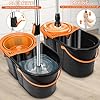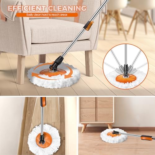 - No dirty hands: The dual swivel feature built into the bucket helps you stop getting your hands dirty when mopping floor. Open the latch on the handle and place the mop on the cleaning or dewatering tank and press up and down, the mop can be spinning to easily control the moisture level of the mop head, leaving your floors clean and streak free.
