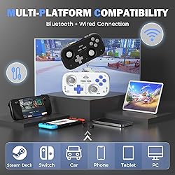 [Compact & Portable Design] Slip it in your pocket and take it anywhere! This ultra-compact wireless controller is ideal for gaming on the go, offering a lightweight yet ergonomic grip for extended play [Advanced Hall Effect Joysticks] Enjoy smooth, drift-free control with high-precision Hall Effect joysticks and a recessed design that enhances grip and control. Combined with a 1000Hz polling rate for ultra-responsive input [Recessed Joystick Design + Bonus Thumb Caps] Features a recessed joystick layout for improved thumb stability and precision during fast-paced gameplay. Comes with two bonus joystick extenders to enhance control accuracy and personalize your grip preference [Customizable Button Mapping] Customize your gameplay with easily reconfigurable buttons and layout. Includes one-click adaptation for different button styles—perfect for users who switch between platforms [Multi-Platform Compatibility] Seamlessly connects via Bluetooth to a wide range of devices—PCs, tablets, smartphones, handheld gaming consoles, car screens, and more. Plug-and-play simplicity without extra drivers [Retro Style, Modern Features] Classic D-pad and ABXY layout inspired by retro aesthetics, upgraded with turbo functions and responsive triggers—blending nostalgia with cutting-edge tech
