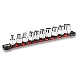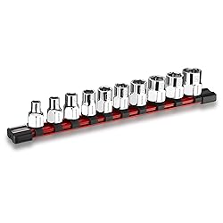 3/8" Drive Socket Set: Includes 10-piece SAE standard and shallow sockets: 1/4", 9/32", 5/16", 11/32", 3/8", 7/16", 1/2", 9/16", 5/8", 11/16". Suitable for medium-duty tasks like automotive repair and small machinery High Strength Construction: Made from Chrome-Vanadium steel with a polished chrome finish. Each socket is laser-engraved with size markings and brand logo for long-lasting visibility Anti-Slip Hex Design: External hex sockets resist slipping and fit perfectly with wrenches for secure and efficient tightening Convenient Socket Rail: Sockets are organized on a sturdy rail with spring-loaded clips for smooth sliding. Both ends feature hanging holes for easy storage 6-Point Design: Grips fasteners on flat surfaces to minimize rounding and deliver optimal torque for reliable fastening