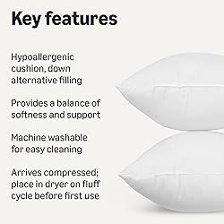 100% Polyester Imported Pillow inserts 18x18 4pack; this cushion inserts multipack works well for chairs, sofas, and beds Ideal as decorative pillow stuffing, the square cushion forms fit inside pillow covers or shams (not included) Arrives compressed; to refluff, place the pillow in the dryer for 5–10 minutes on the Air/Fluff cycle, or fluff vigorously by hand. Repeat until the desired loft is achieved.Machine washable for easy care For a fuller, tailored look, size up your insert by 2 inches Couch pillow inserts bulk make a great choice as sofa pillow filling for added softness and support Cushions with hypoallergenic down alternative fiberfill for a fluffy appearance and comfortable feel Certified STANDARD 100 by OEKO-TEX, which requires textiles-based products to be tested against a list of 1,000+ chemicals, to limit those which may be harmful to human health Reshape and fluff after washing Designed and Assembled in the USA under strict quality control standards This product contains 90% Recycled Claim Standard (RCS) certified recycled polyester