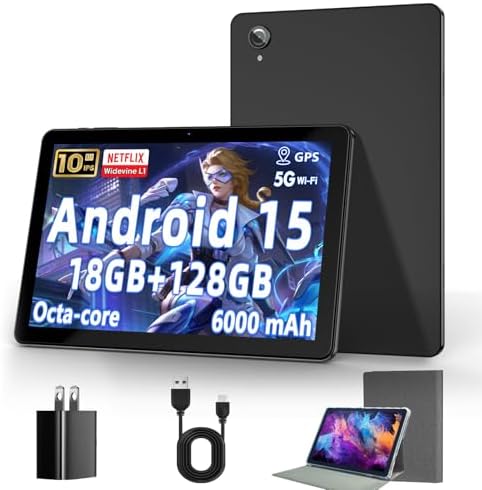 10 Inch Tablet, Android 15 Tablets with 18GB RAM+128GB ROM(Expand to 1TB), Octa Core 1280 * 800 IPS HD Display, 6000mAh Battery, Dual 5MP+8MP Camera, 5G/2.4G WiFi